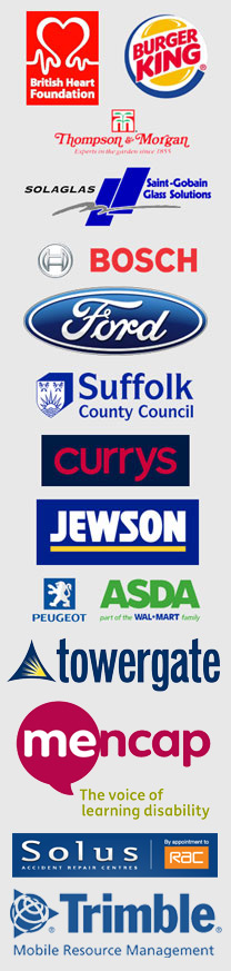 Corporate: Suffolk County Council, Mencap, NOAH, eJobdone, Trimble MRM, Towergate Insurance, Solus ARC, Secure Tag, Karl King Transport, Thompson & Morgan